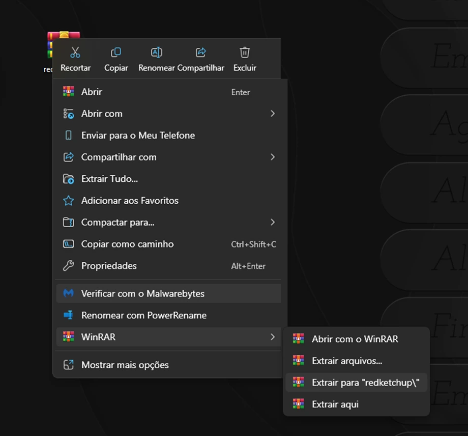 2- No final dessa janela, passe o mouse pelo botão “WinRAR” e clique na opção “extract to redketchup\” – Isso fará que os arquivos sejam extraídos para uma nova pasta