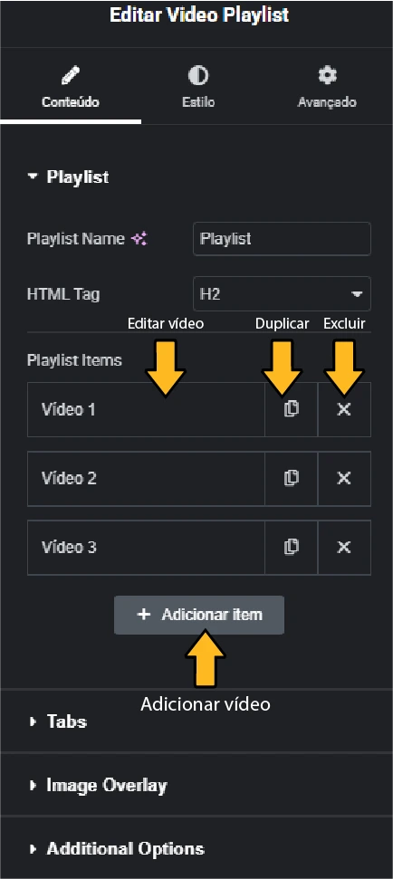 Caso queira duplicar um vídeo, clique no botão com ícone de duas páginas. Caso queira remover um vídeo, clique no botão “X”. Caso queira adicionar um vídeo novo, clique em “Adicionar item”